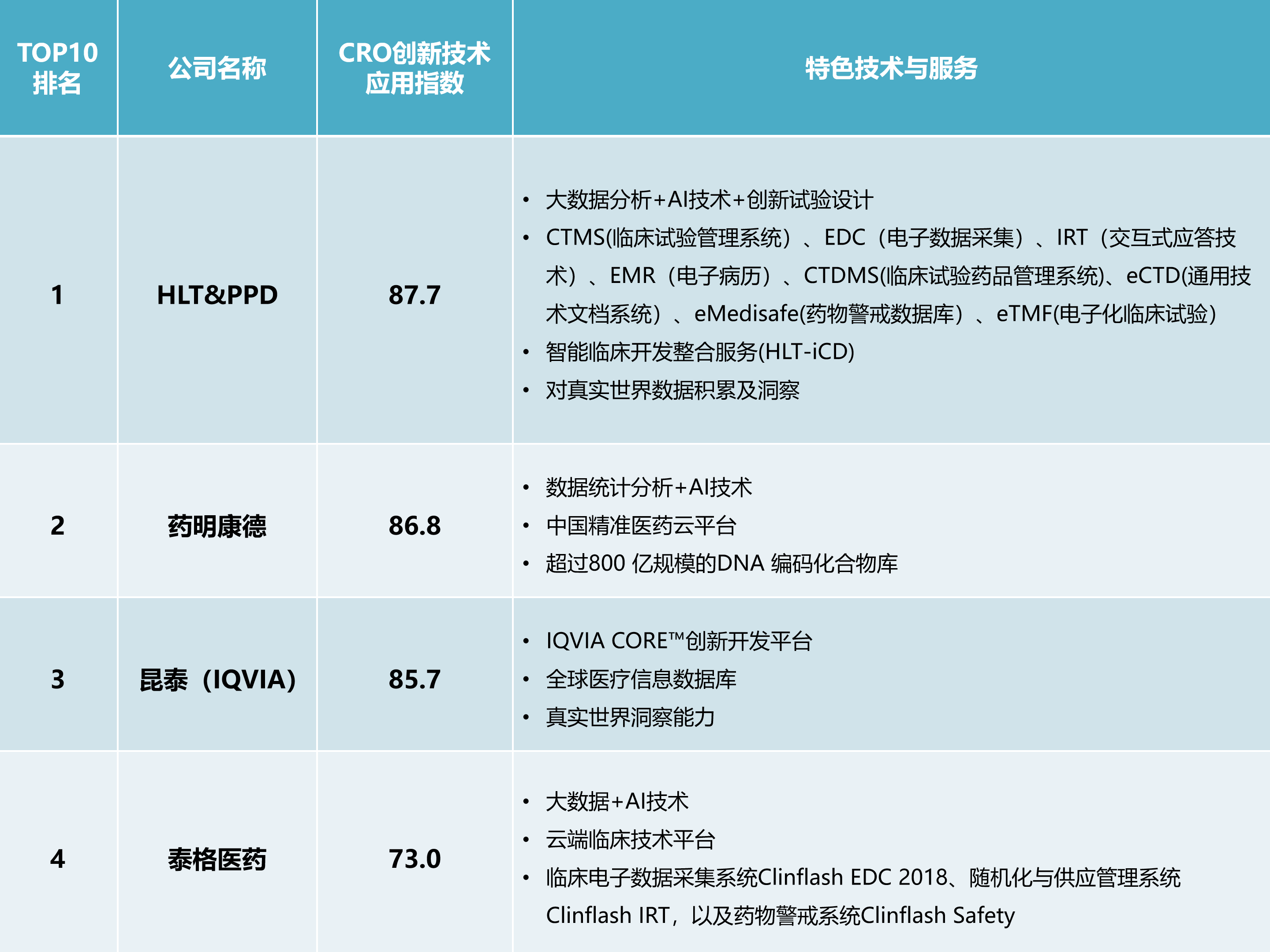如公司正在2018年成功推出WuXiBody™ 双性抗体平台,此外,两者强强合做,最终给出2019年中国新型CRO企业TOP10排名。正在缩短医药研发周期、降低研发费用中的感化更加显著。通过取IMSHealth归并,实现HLT正在医疗范畴的大数据手艺、AI手艺及科技实力取PPD正在全球范畴内领先的临床研究能力完满连系。